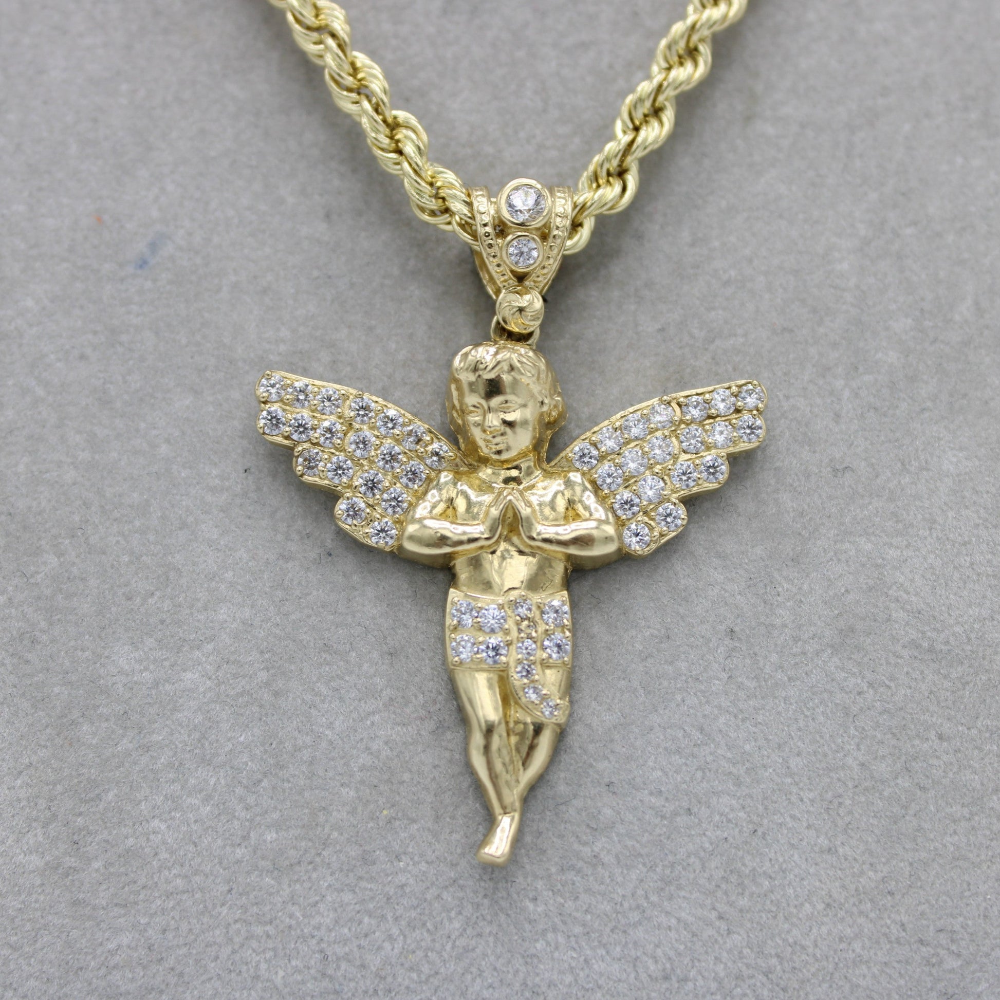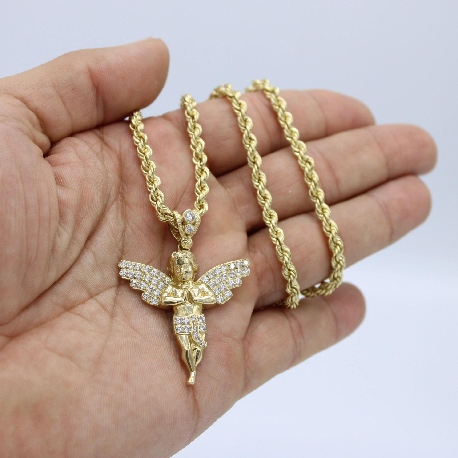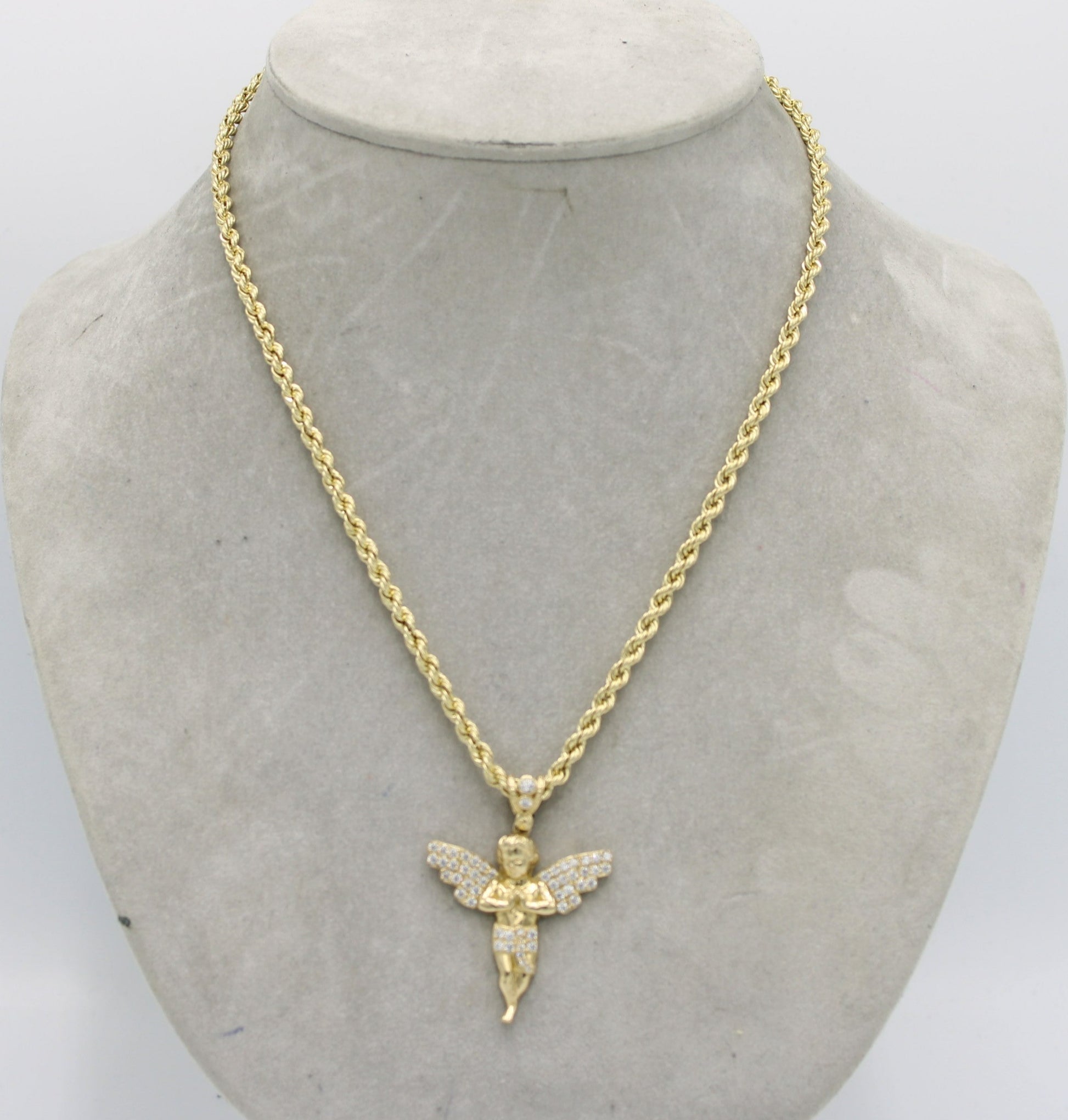 14K Angel Pendant Cz Stones with Rope Chain Yellow Gold