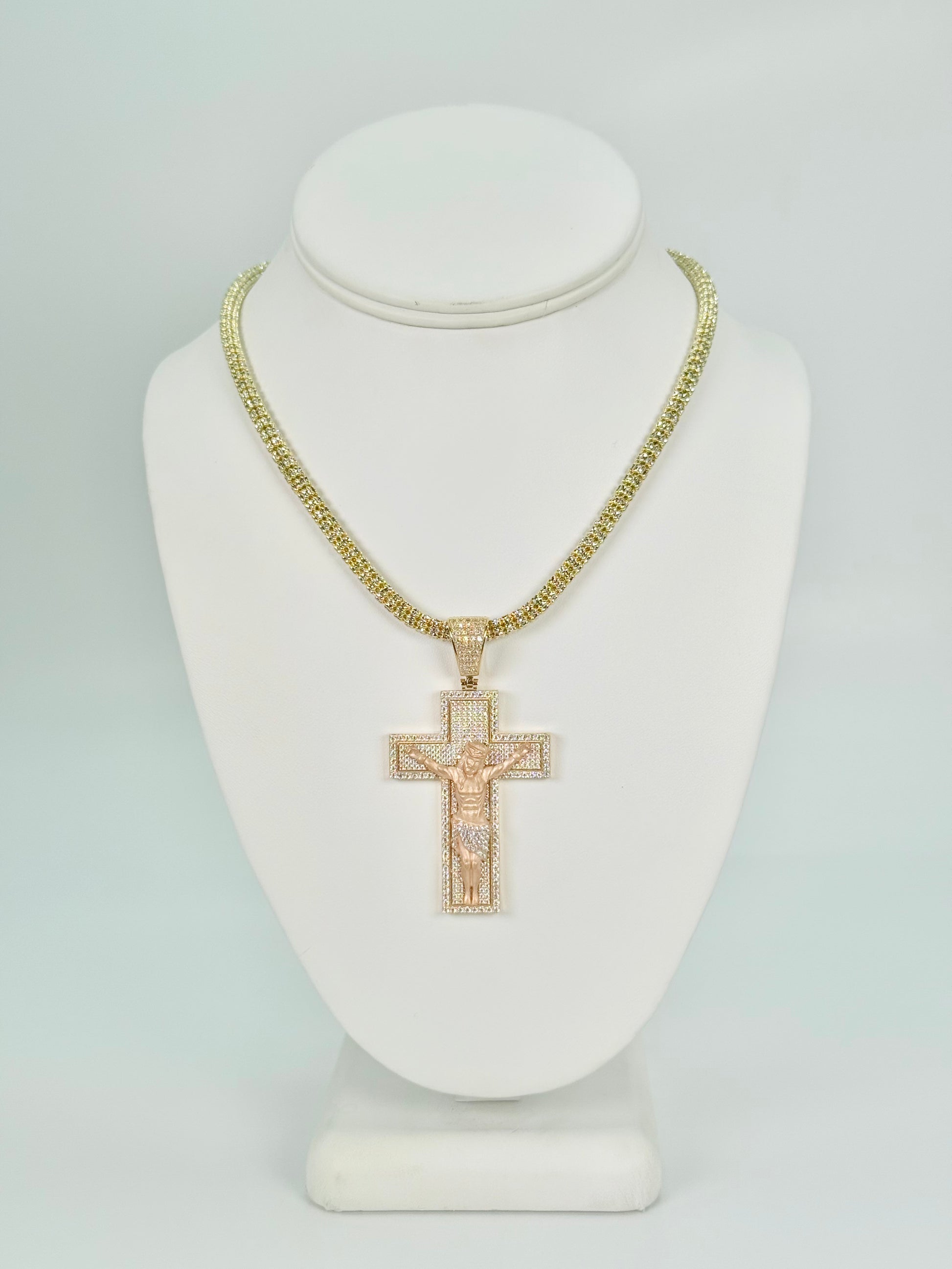 14K Jesus Christ Cross Pendant Two Tones (Yellow And Rose Gold) With Ice Chain Yellow Gol