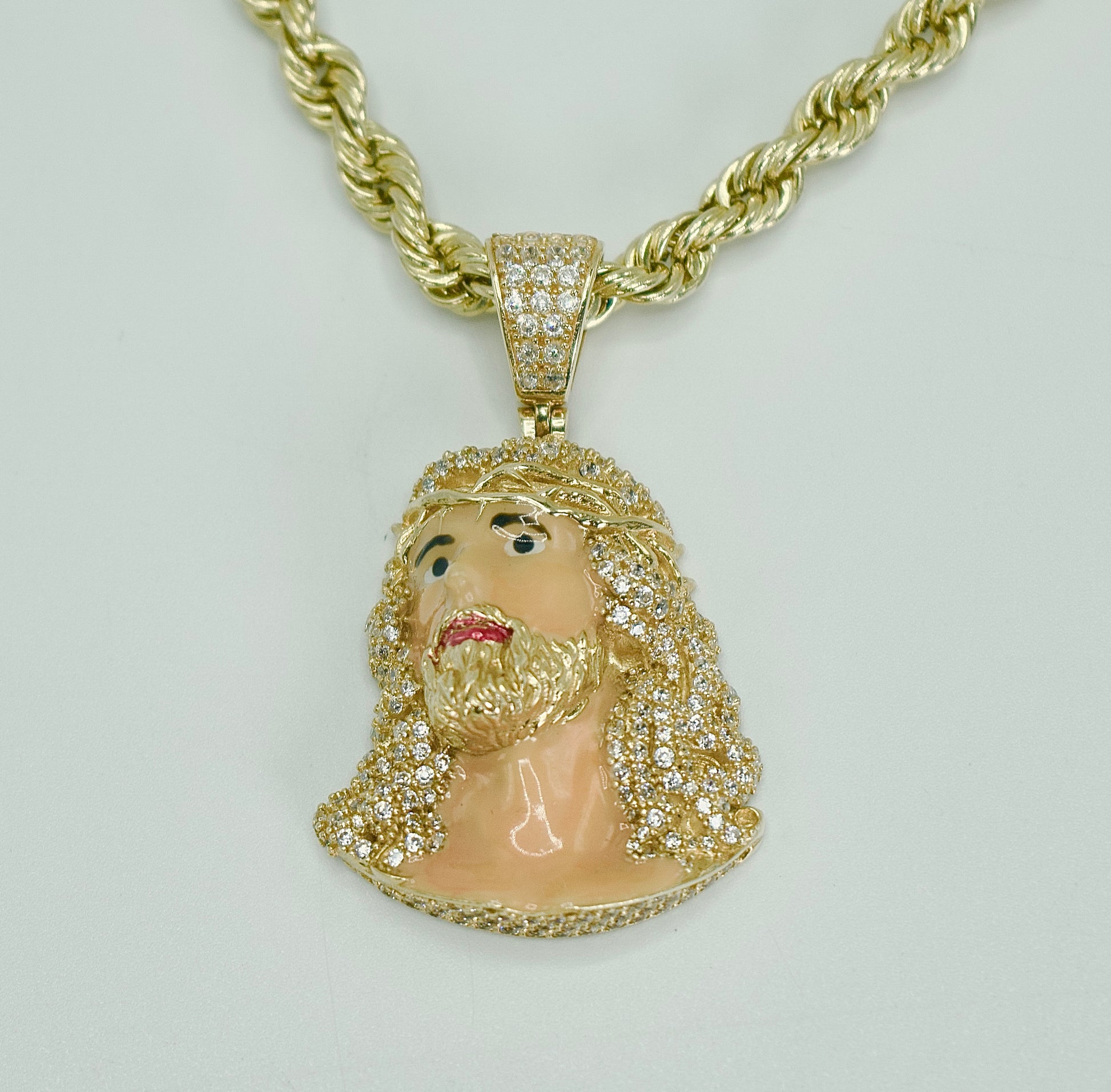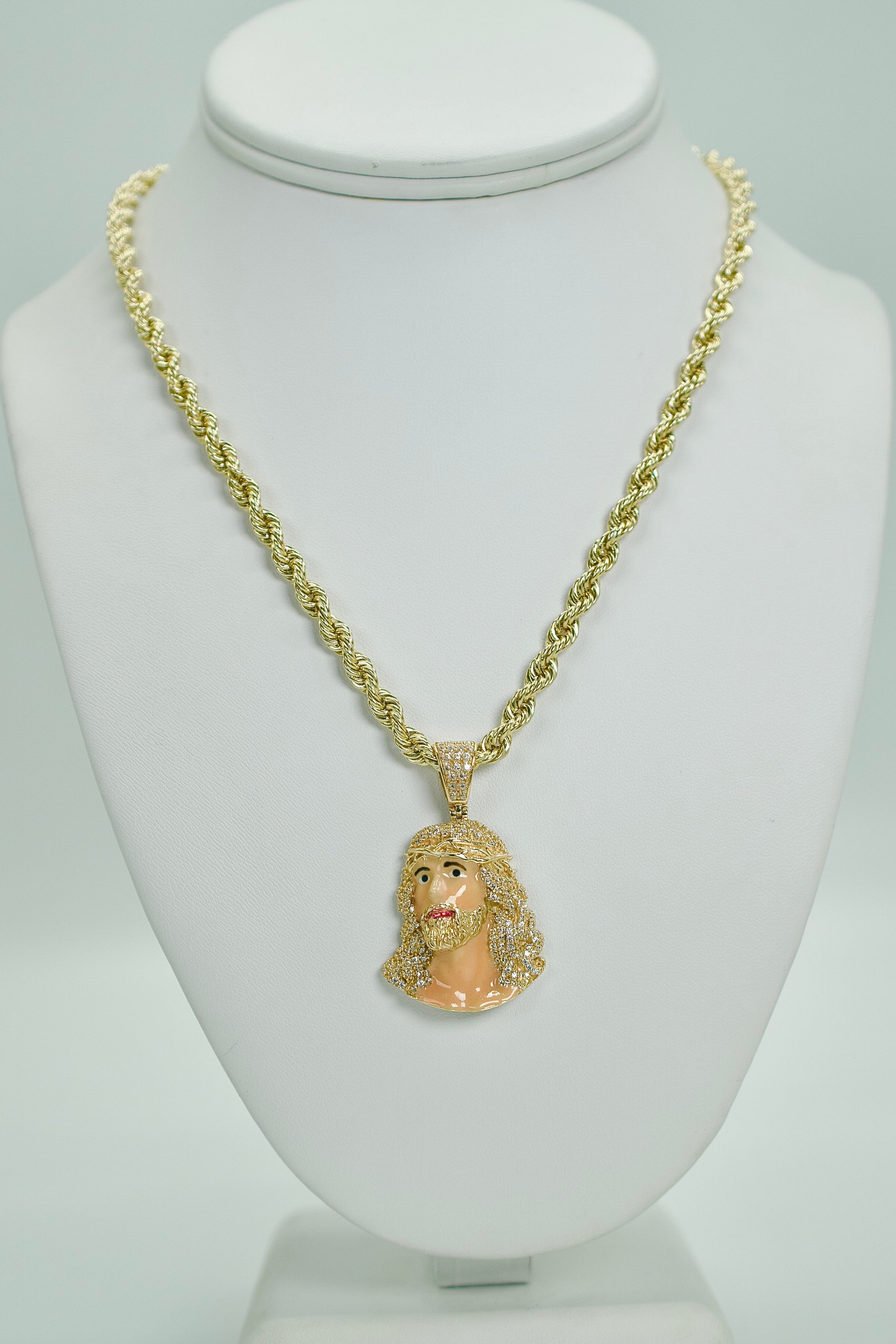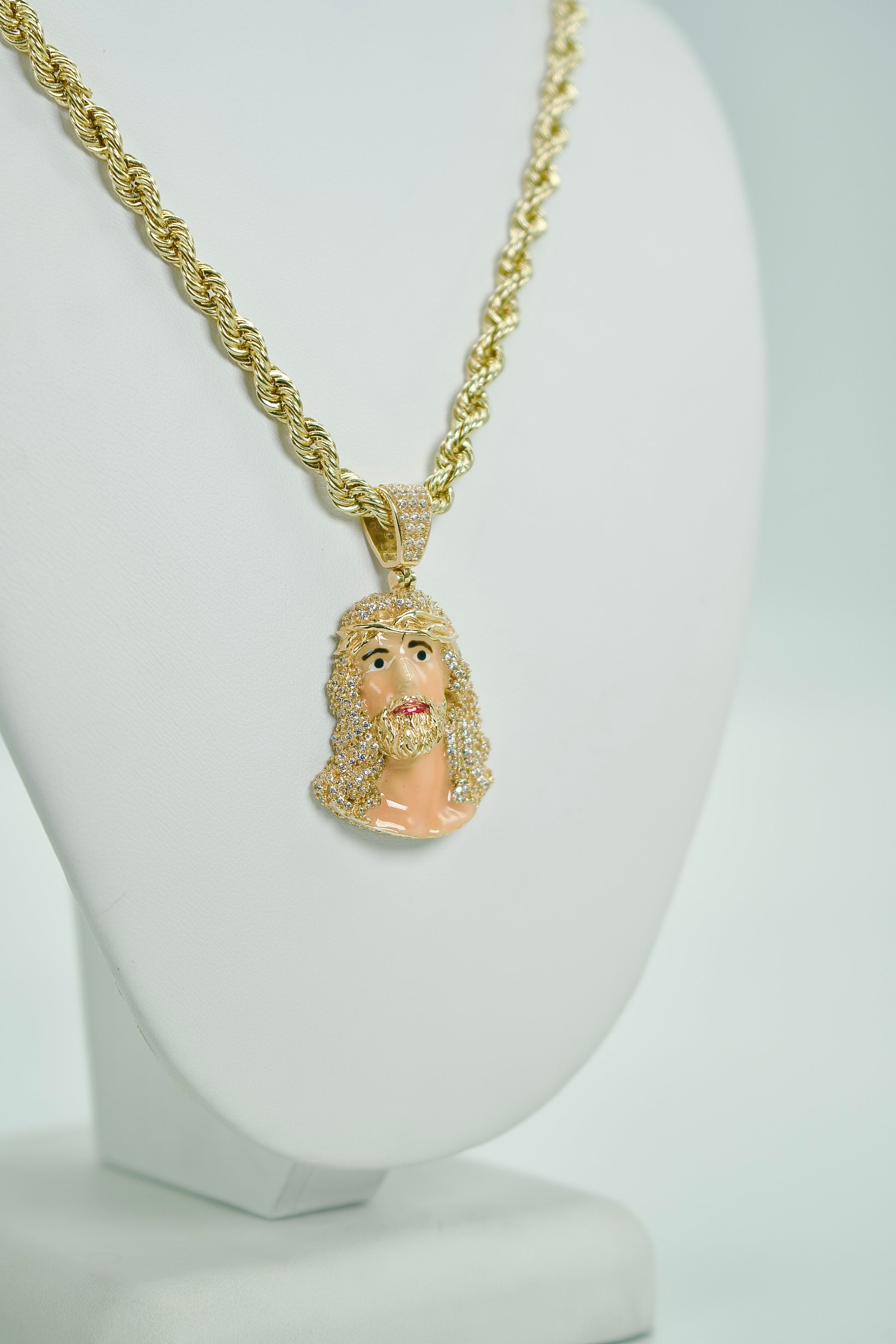 14K Jesus Face Pendant Cz Stones With Rope Chain Yellow Gold