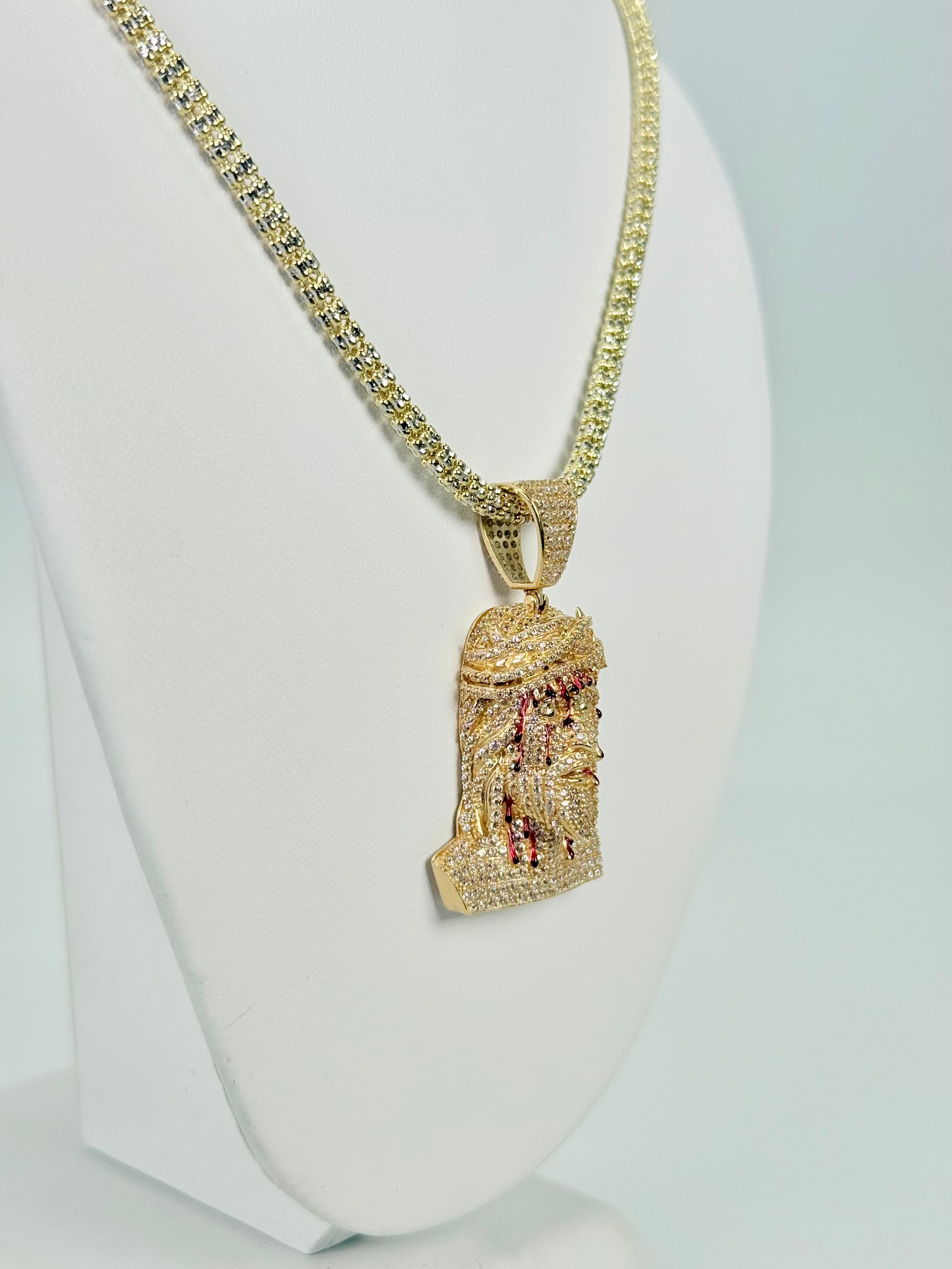 14K Jesus Face Pendant Cz Stones With Ice Chain Yellow Gold