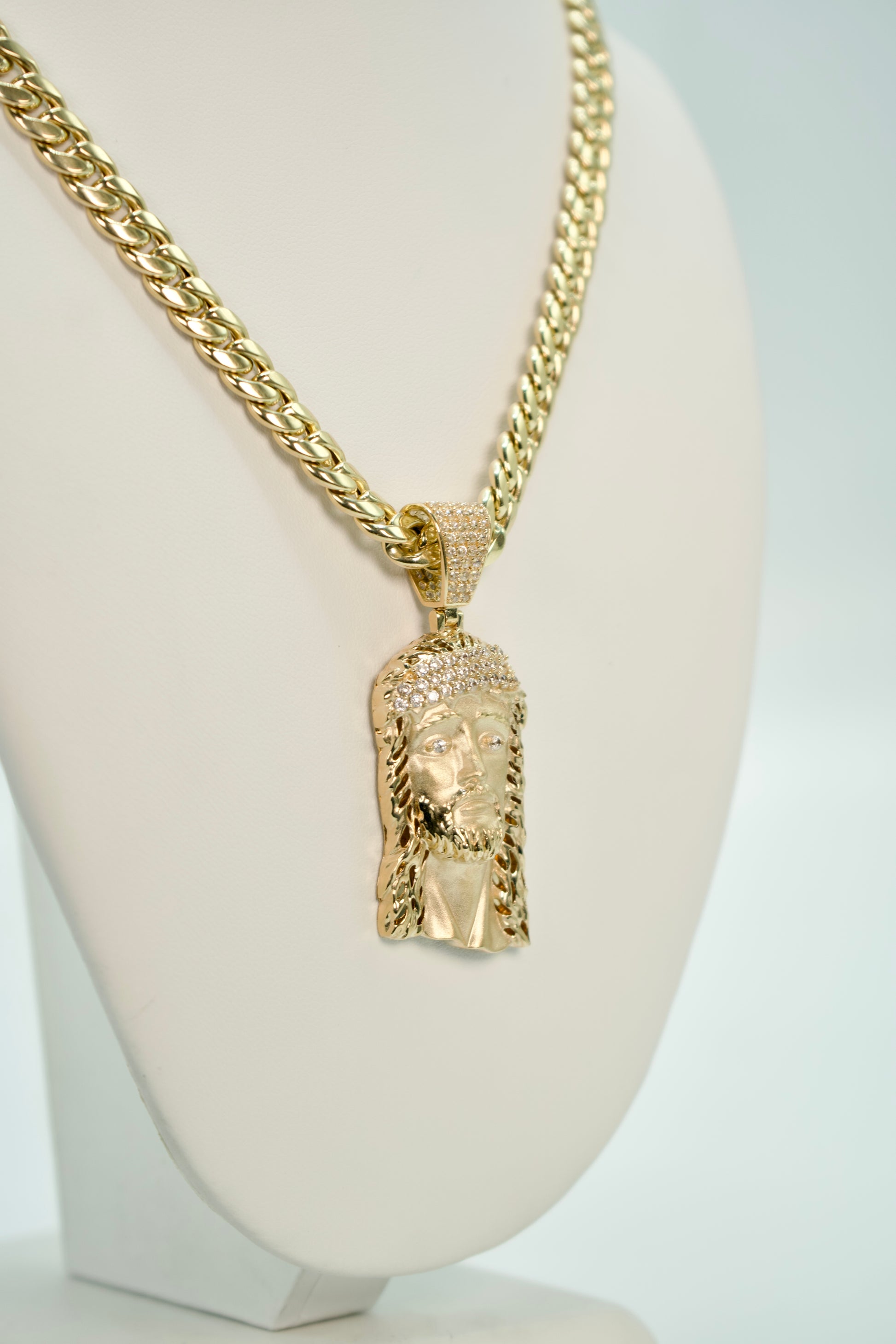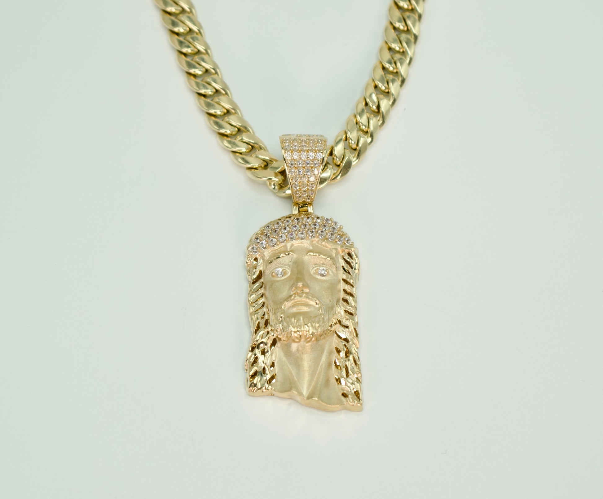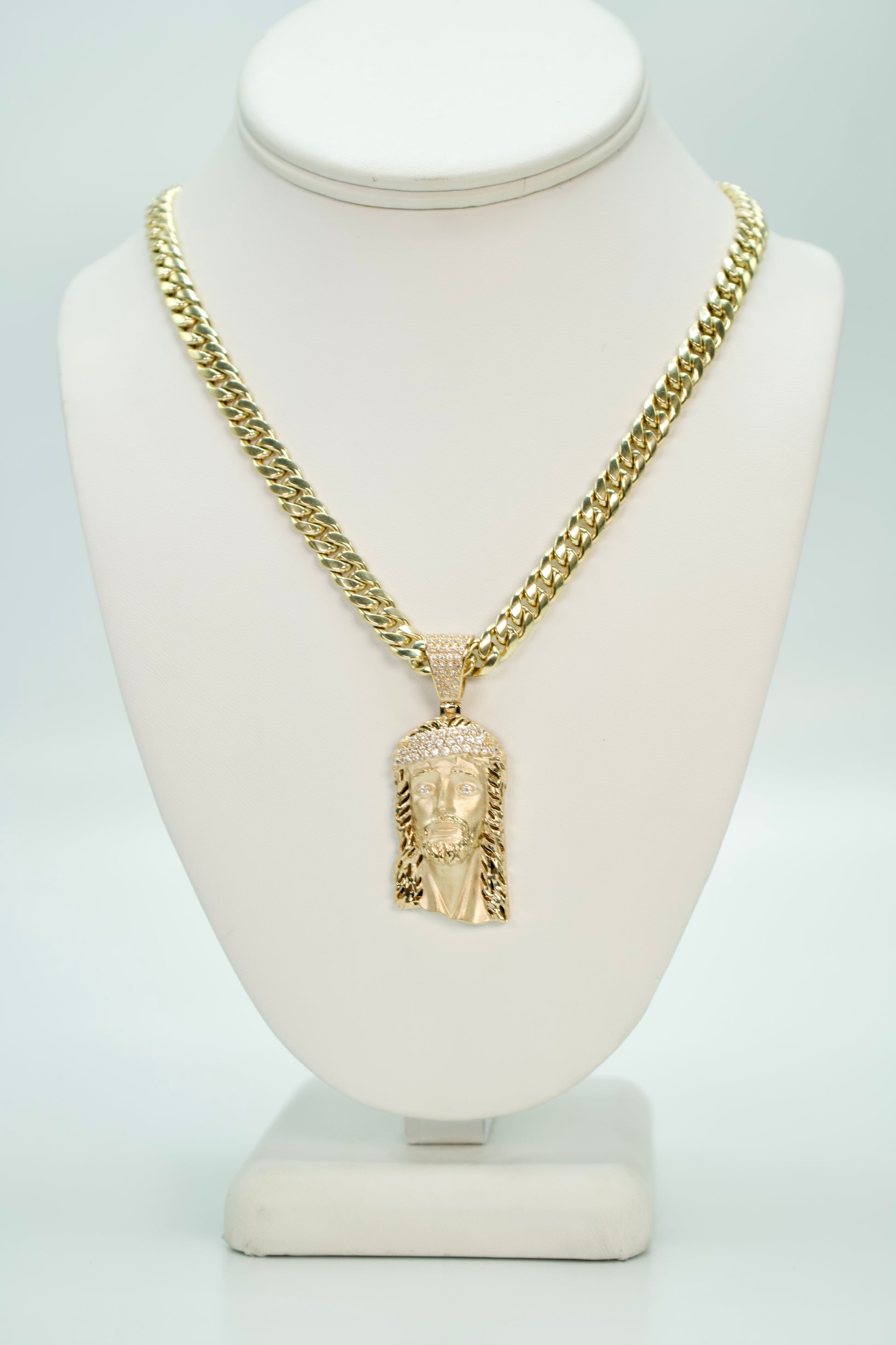 14K Jesus Face Pendant Cz Stones With Miami Cuban Chain Yellow Gold