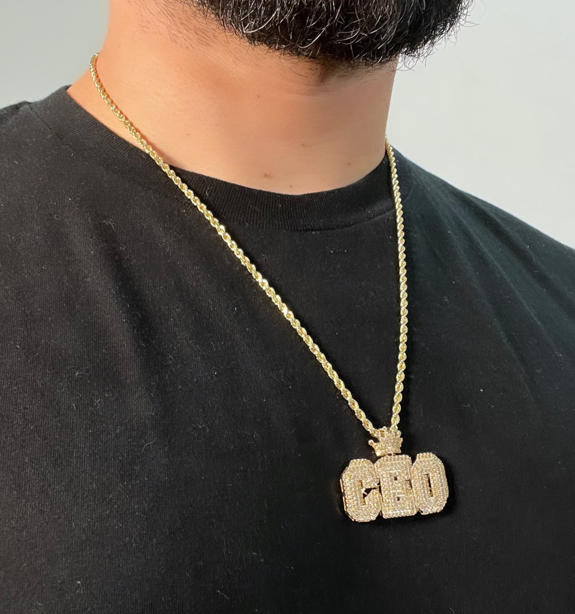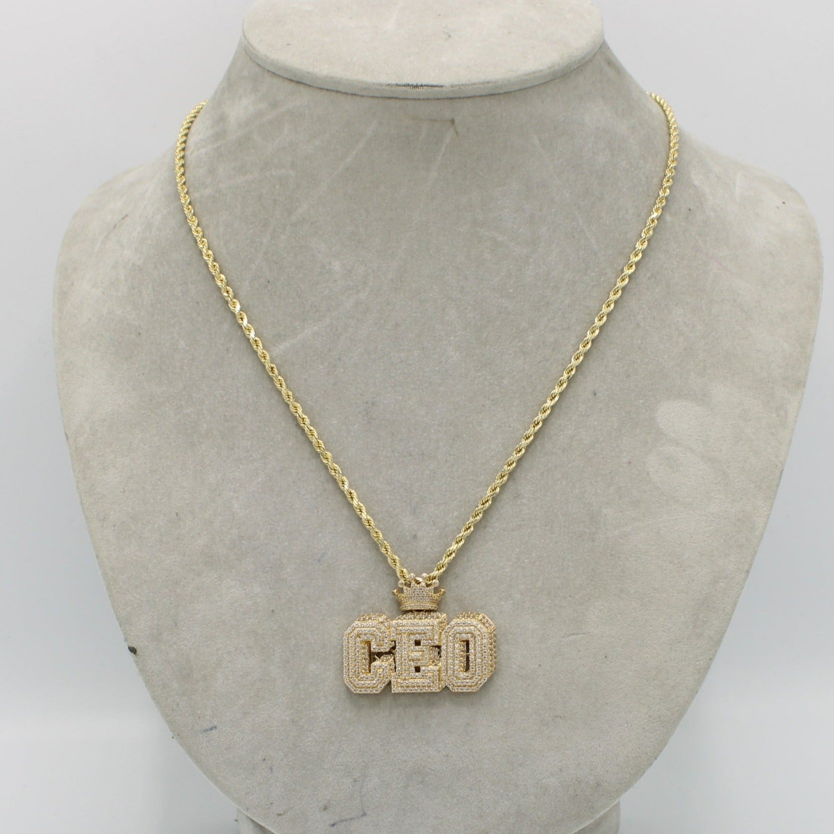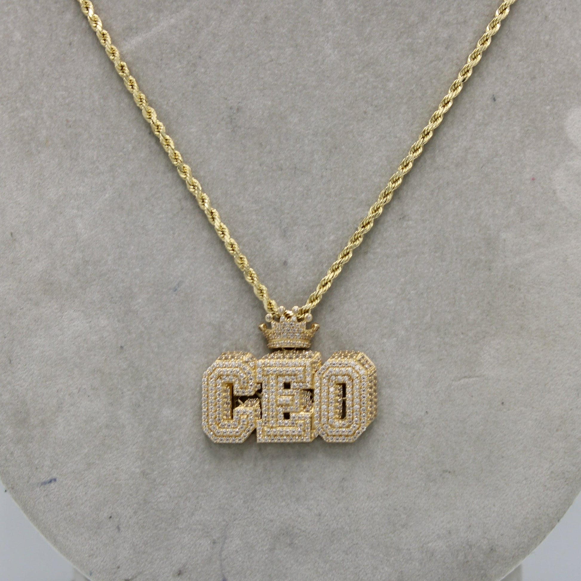 14K CEO Pendant Cz Stones With Rope Chain Yellow Gold
