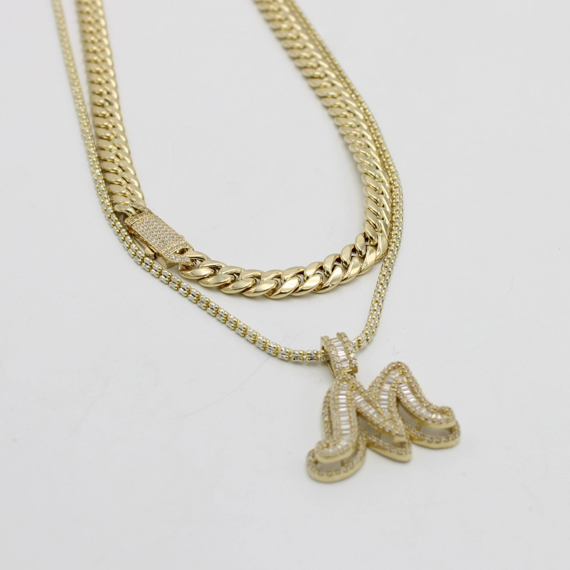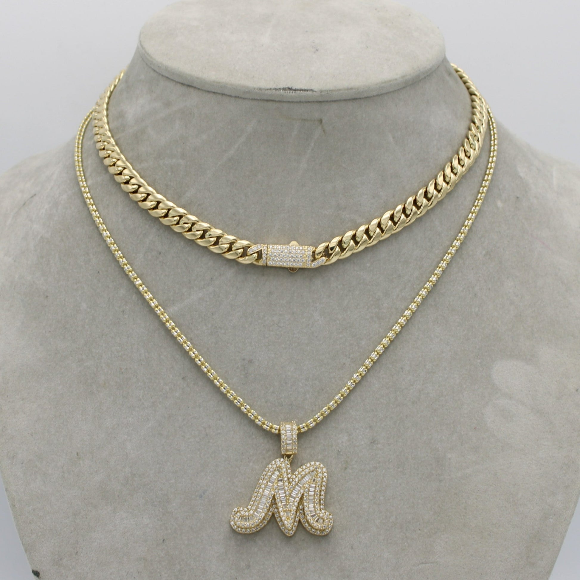 14K Set Choker Miami Cuban Link With Ice ice Chain (20") with Initial Baguette/Cz Stones Yellow Gold
