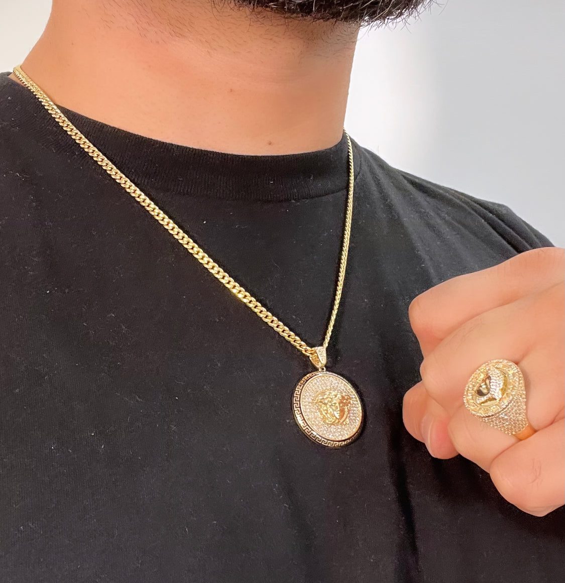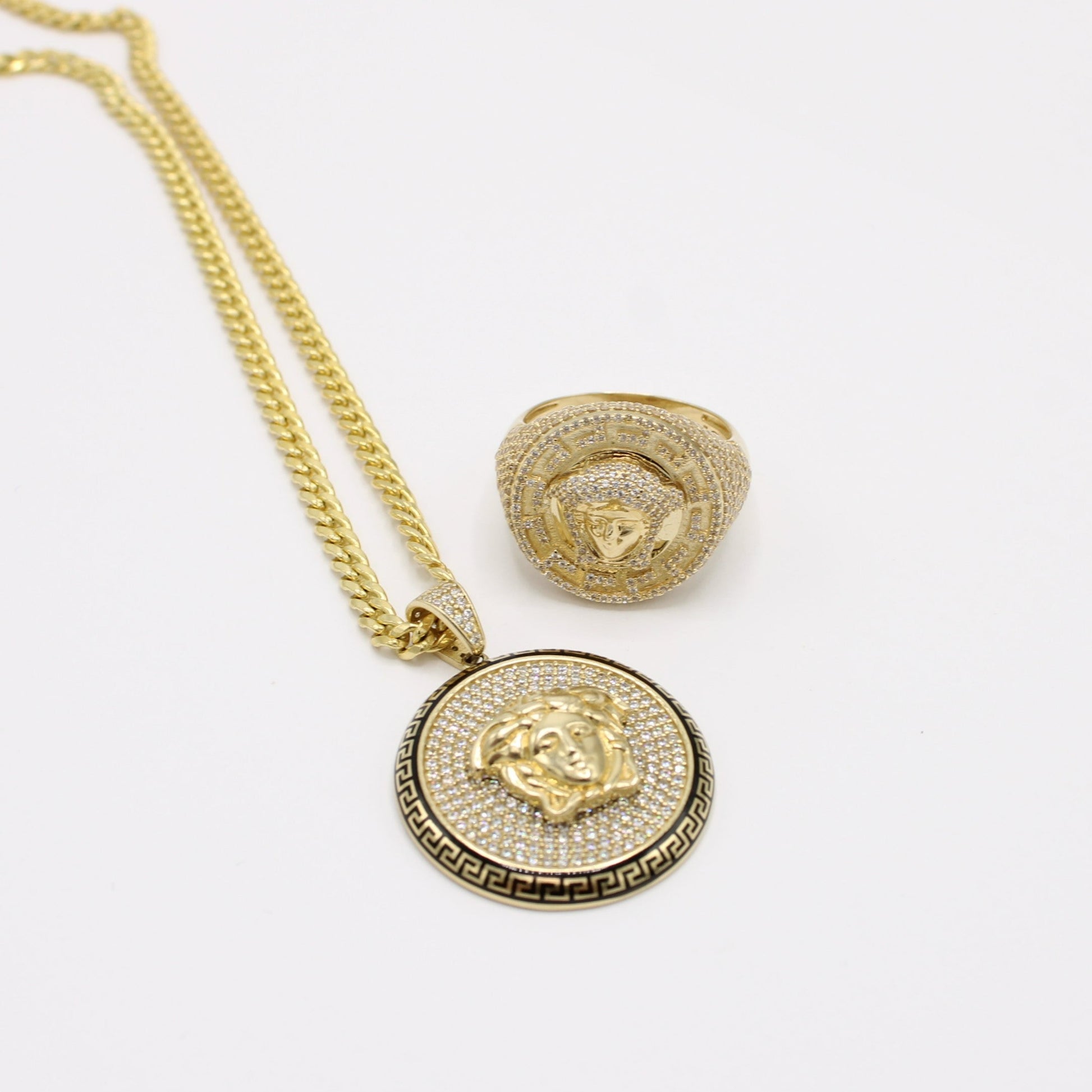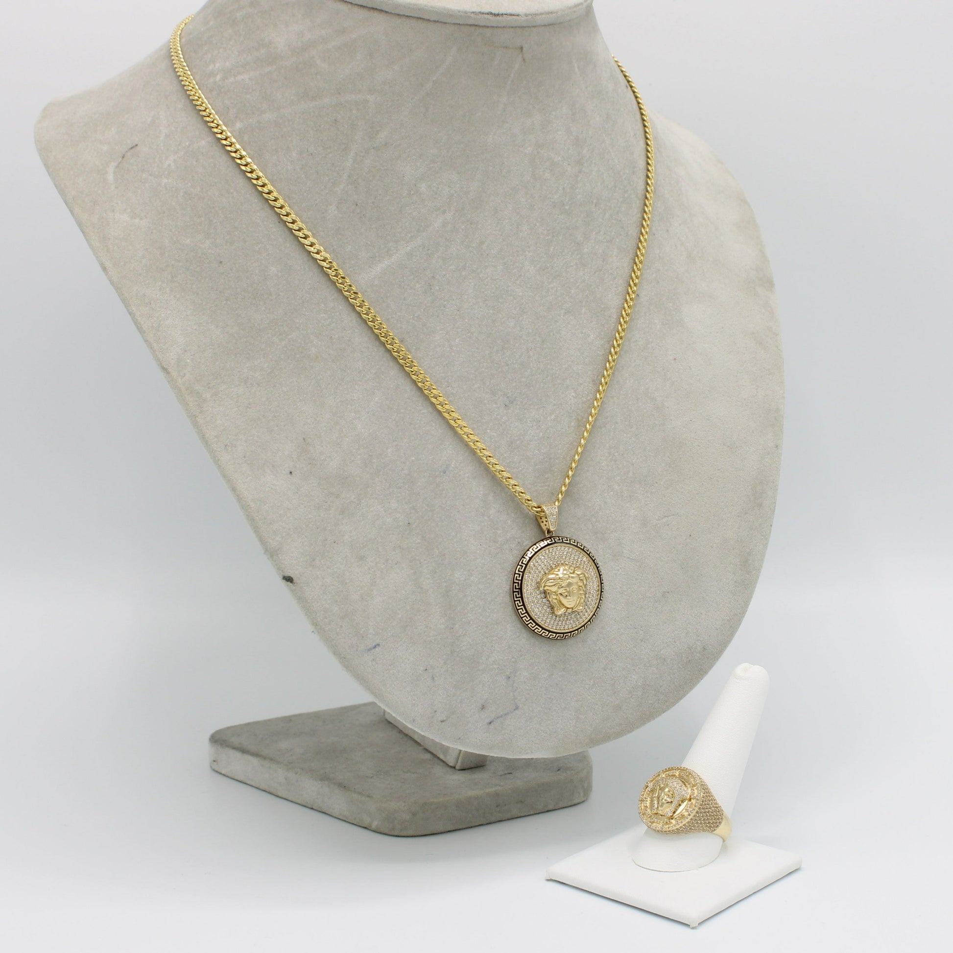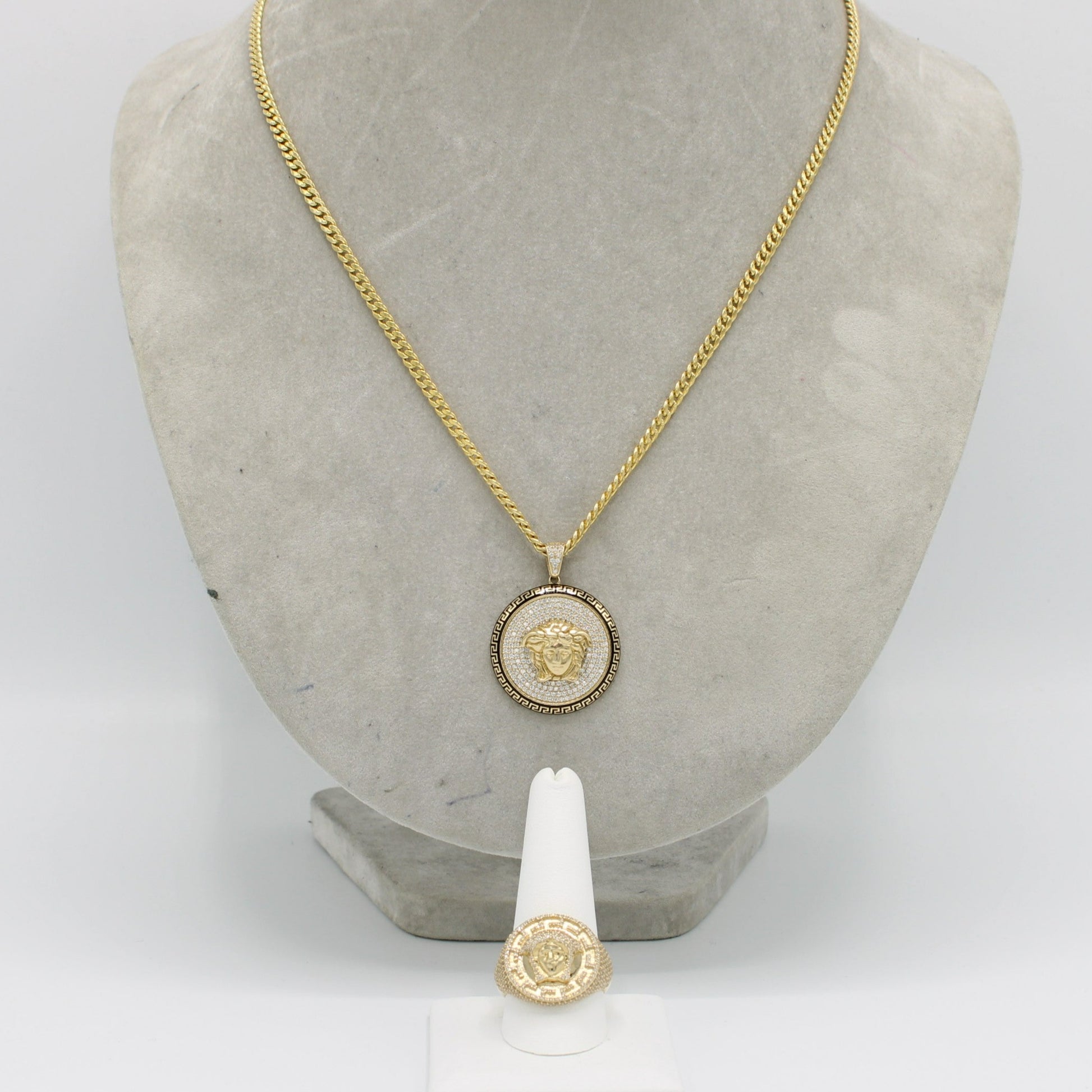 14K Set Medusa Ring / Pendant Cz Stones With Miami Cuban Chain Yellow Gold